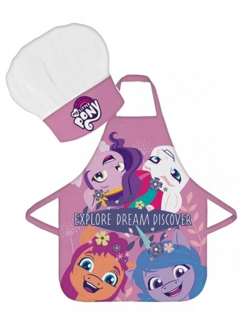 Skoninga „My Little Pony“ violetinė šefo prijuostė su kepure paskatins gaminti tik pačius nuostabiausius patiekalus, kurie pirmiausia traukia savo skoniu, o paskui ir estetika. Gera, kad gaminti galima taip stilingai apsirengus. Komplektą sudaro prijuostė ir kepurė. Kepurės dydis reguliuojamas.