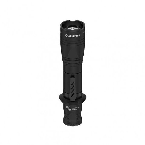 Armytek prožektorius Dobermann Pro Magnet USB - tai taktinis du viename žibintuvėlis su magnetiniu baterijos pakrovėju. Šis modelis turi siaurą spindulį ir tolygų perėjimą iš centrinio karšto taško į periferinę šviesą.
