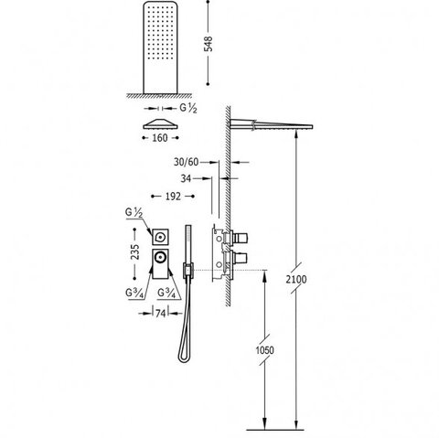 maišytuvas su potinkine dalimi; dušo galva, skirta montuoti į sieną  rankinis dušiukas su žarna ir laikikliu.