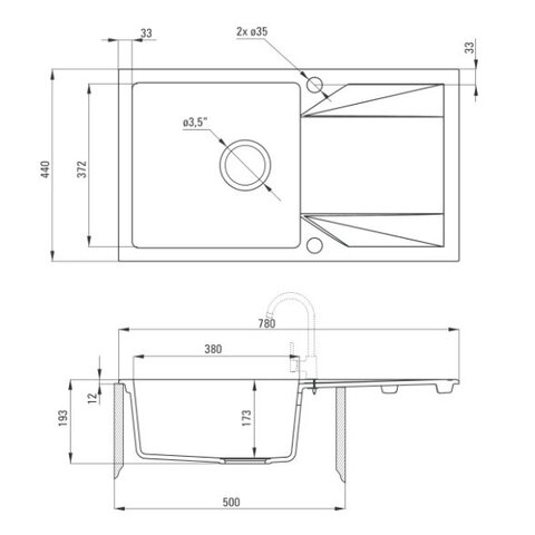 Ilgis: 78 cm. Plotis: 44 cm Gylis: 18 cm Medžiaga: granitas Minimalus spintelės plotis: 50 cm Apsukama, t.y. dubuo gali būti ir kairėje ir dešinėje pusėje Sifonas Spacesaver su ventiliu komplekte Atspari įbrėžimams; Atspari aukštai temperatūrai iki 250 laipsnių karščio; Atspari spalvos pakitimams; Pajungimas prie indaplovės; Dubuo su persipylimu.
