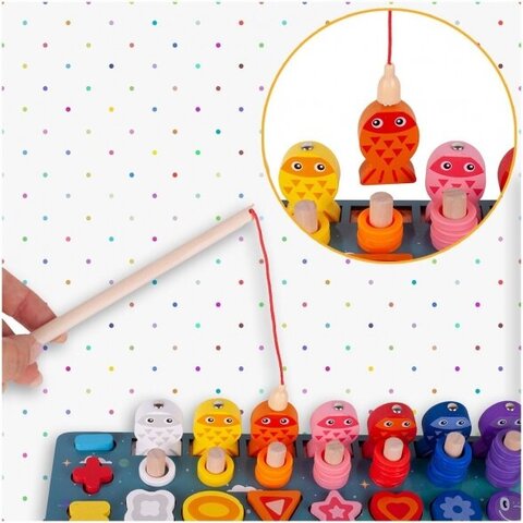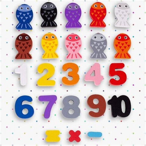 -skaičiai 10 vnt -formos 10 vnt -transporto priemonės 7 vnt -Matematiniai požymiai: 3 vnt - apskritimai: 55 vnt - mediniai stulpai: 10 vnt Magnetinė žuvis 10 vnt meškerė